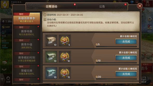 3、累计击毁坦克*20,[优质材料宝箱]*10,[S3赛季奖章]*15