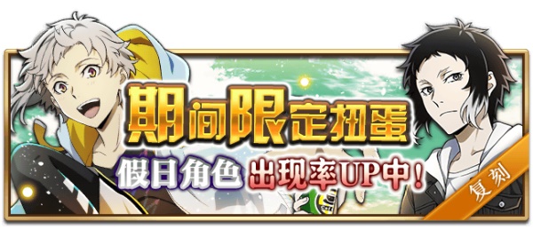 活动时间:4月3日13:00~4月10日12:59(8天) ①期间限定扭蛋:SSR【休日】中岛敦、 SSR【休日】芥川龙之介、SR【休日】谷崎润一郎、SR【休日】梶井基次郎 ②阶段上升扭蛋:到达第二阶段可获得SR特别兑换券*1,到达第五阶段必得SSR*1,到达第七阶段可获得SSR特别兑换券*1,到达第八阶段SSR出现率高达1.5倍且不限次数! SR特别兑换券:可在SR【休日】谷崎润一郎和SR【休日】梶井基次郎中任选其一进行兑换 SSR特别兑换券:可在SSR【休日】中岛敦和SSR【休日】芥川龙之介中任选其一进行兑换