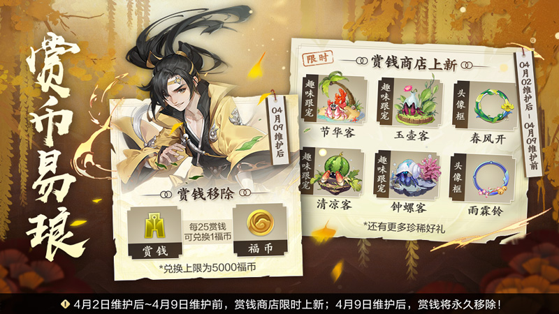 三妹小贴士:4月9日维护后,赏钱商店将永久歇业。赏钱将以25:1的比例转化为福币(兑换上限为5000福币)店内部分售卖物品将在其他商店中上架;同时游戏内赏钱产出途径将调整为其他货币。