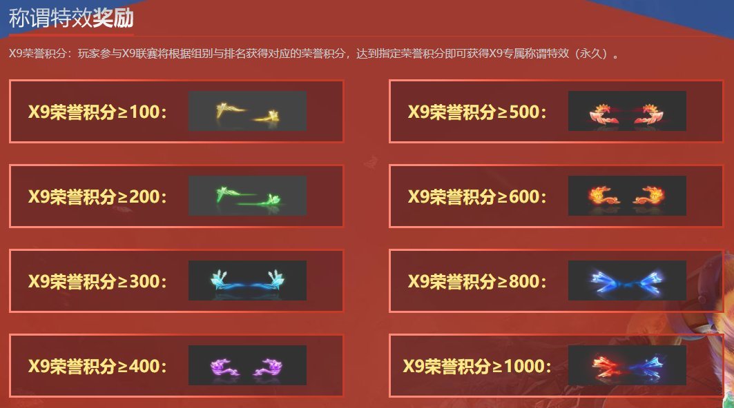 除此之外,根据战斗成绩,参赛玩家还能积累X9荣誉积分,用于兑换称谓特效。获得神威、勇武、精锐前三名的玩家,更能获得战斧队标一份!