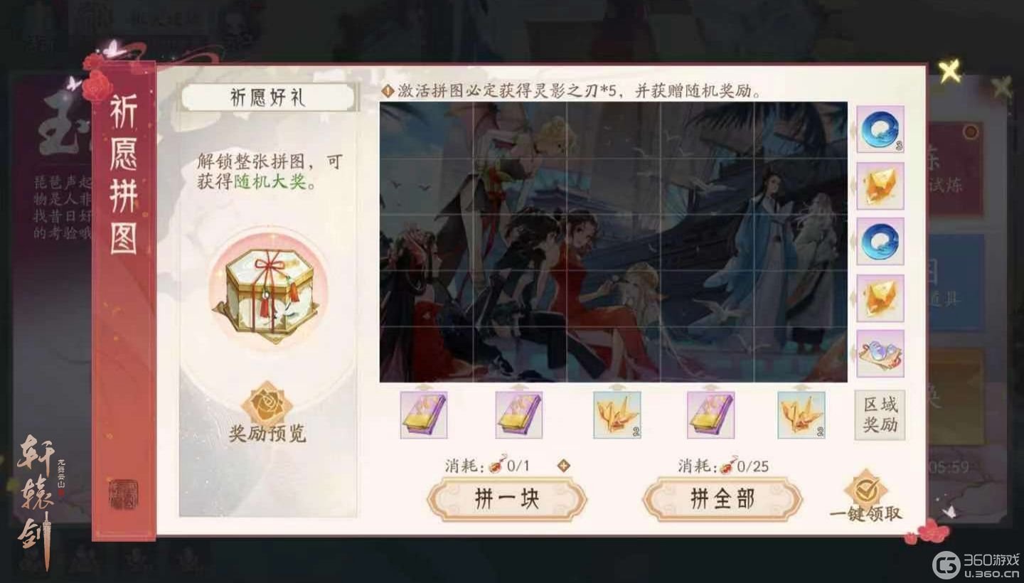 **期间,少侠每日参与挑战都可获得“玉儿的祝福”,消耗道具进行祈愿即可解锁拼图,每解锁一张拼图都可获得随机奖励,解锁每行、每列的拼图时还可领取额外奖赏。