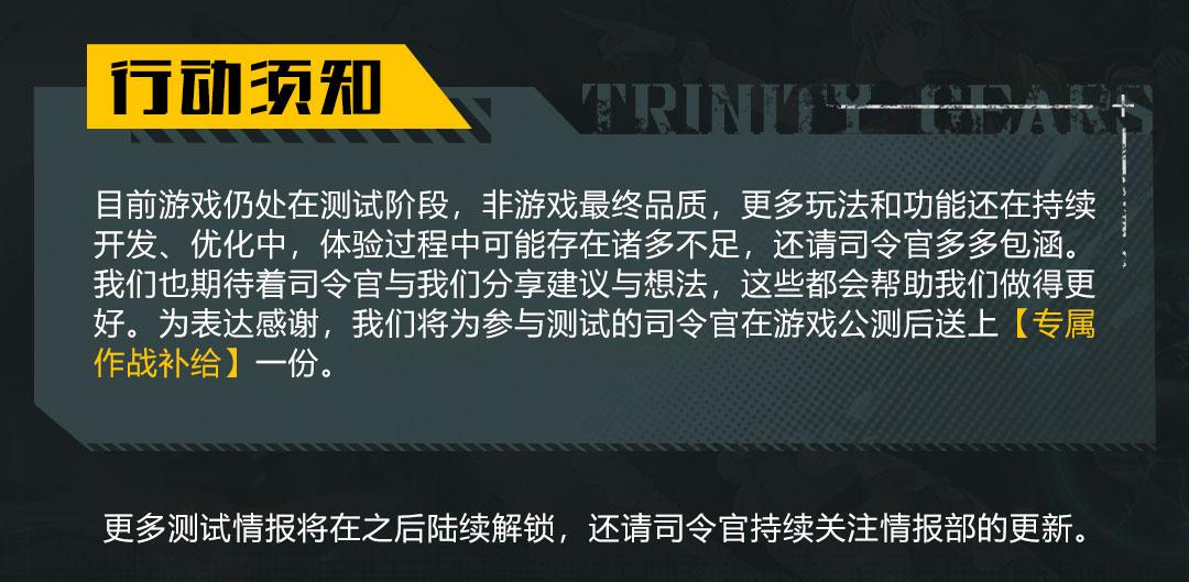 值得注意的是,本次删档测试版本为开发中的游戏版本,不代表游戏最终品质。体验过程中可能会出现 BUG 及异常情况,欢迎各位司令官进行反馈。