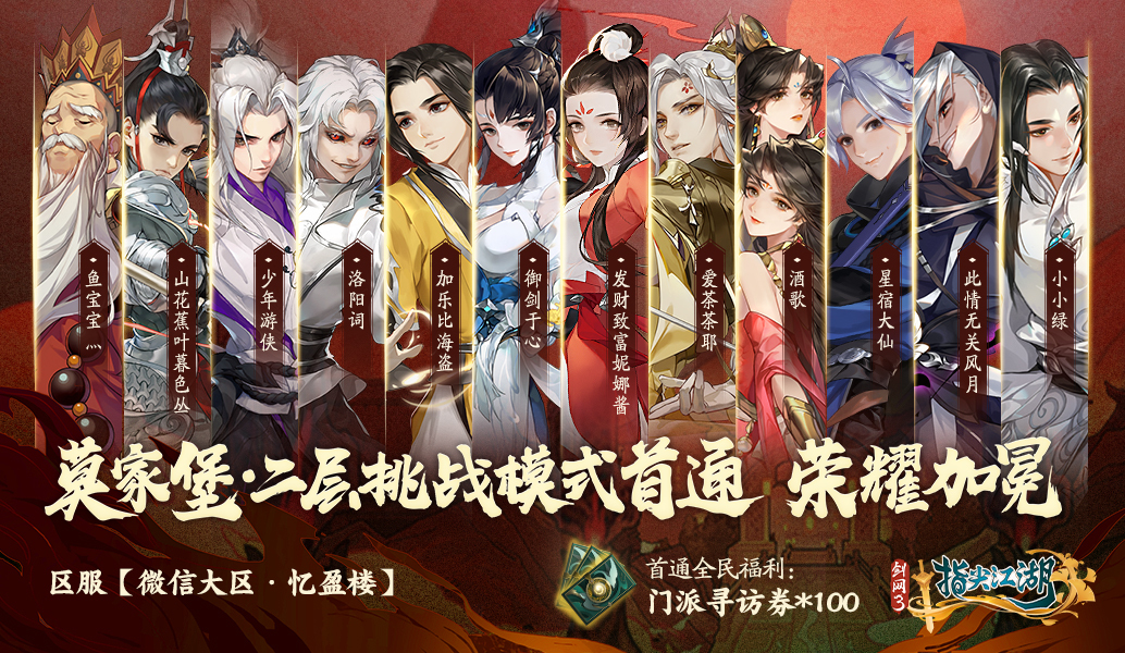 超高难度?莫家堡·二层?拿下!为庆贺莫家堡·二层挑战模式首通,我们将在5月14日维护后,为全区全服赠送【门派寻访券*100】!首通团队每人将获得专属荣誉头像框【血舆吟】、可交互背部挂件【血影天宇舞姬】、GSC莫雨穆玄英手办、《乘梦江湖》音乐专辑等丰厚奖励!
