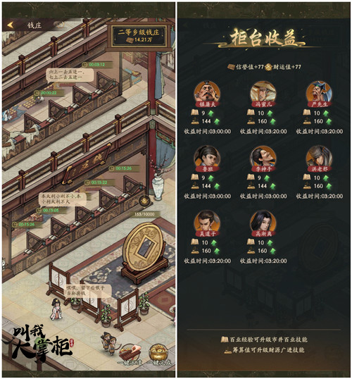 游戏中,当掌柜身份到达15级即可开启钱庄。在该项玩法中玩家需要通过经营、升级柜台,利用信誉值提升钱庄,从而获得大量银两奖励。当然,掌柜还可以通过派遣门客至钱庄柜台获得百业经验、筹算值和信誉值等丰厚奖励。
