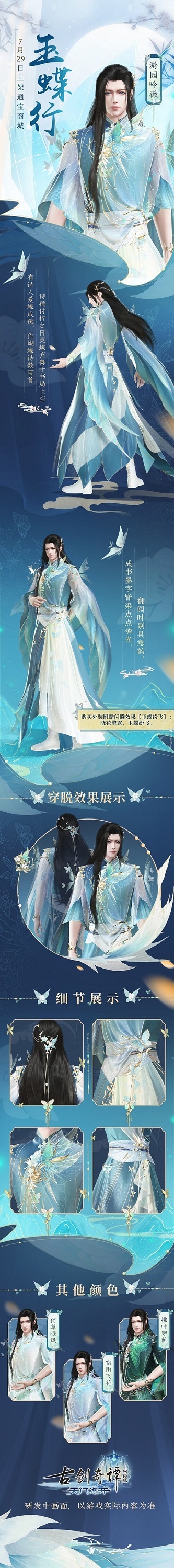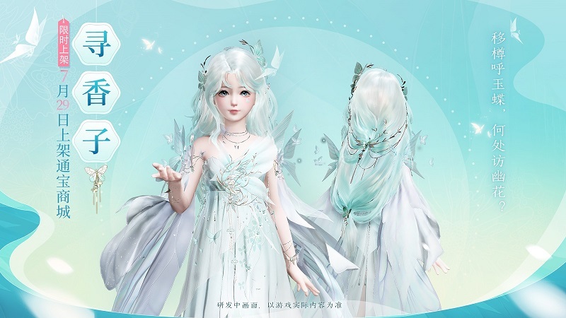 将在7月29日与暑期资料片“天门终开”同步上线的全新“玉蝶行”系列外装,浅色款着重突显了蝴蝶的飘逸美感,全新制作的镭射材质黑科技也使得整套外装于阳光下流光溢彩,行止之间恍若谪仙。