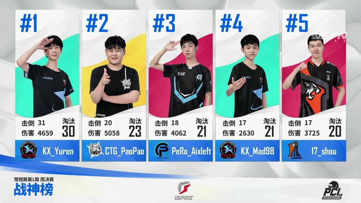 CTG战队的PaoPao则以5058点伤害量获得本周输出之最,他也成为CTG战队拿下周季军的中流砥柱。此外,众多战神榜的常客本周也悉数亮相,分别是PeRo战队的Aixleft、KX战队的Mad98与17战队的shou。