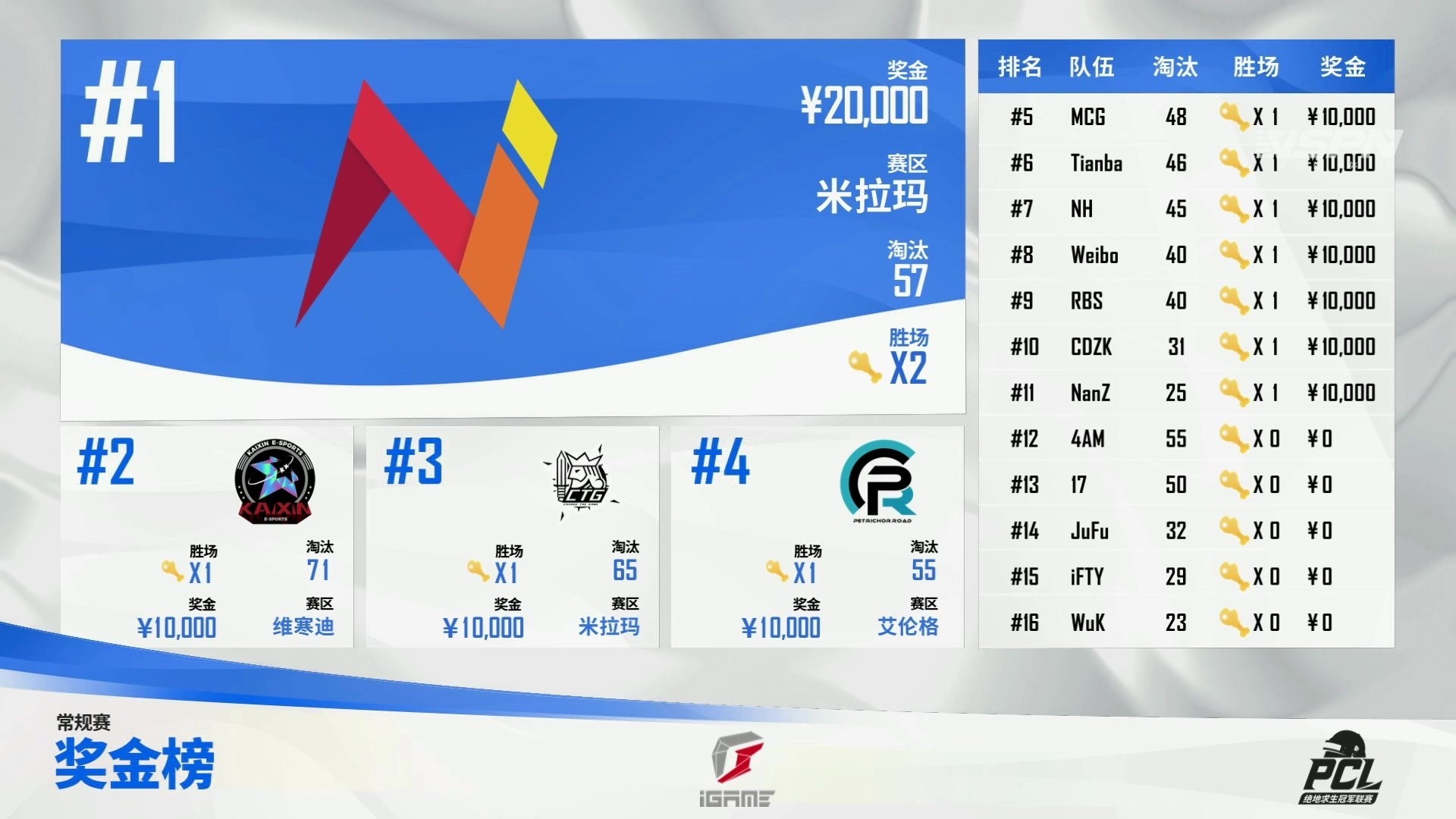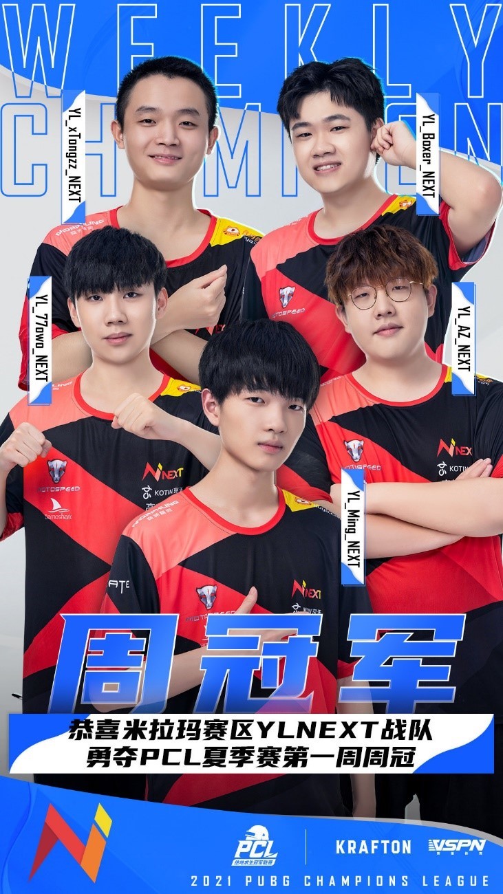 【Krafton Inc.旗下PUBG工作室】乘风破浪,一往无前!由Krafton Inc.旗下PUBG工作室举办的2021年绝地求生冠军联赛(PUBG CHAMPIONS LEAGUE,简称“PCL”)夏季赛常规赛的第一周比赛已经结束。由于天气原因,周决赛第二日比赛推迟了2天进行。最终,YLNEXT战队以2鸡57个淘汰拿下第一周的周冠军,KX战队凭借最后一局的精彩发挥后来居上,以1鸡71个淘汰数获得亚军。CTG战队则一鸣惊人,屡次打出精彩发挥,以1鸡65个淘汰位列第三。