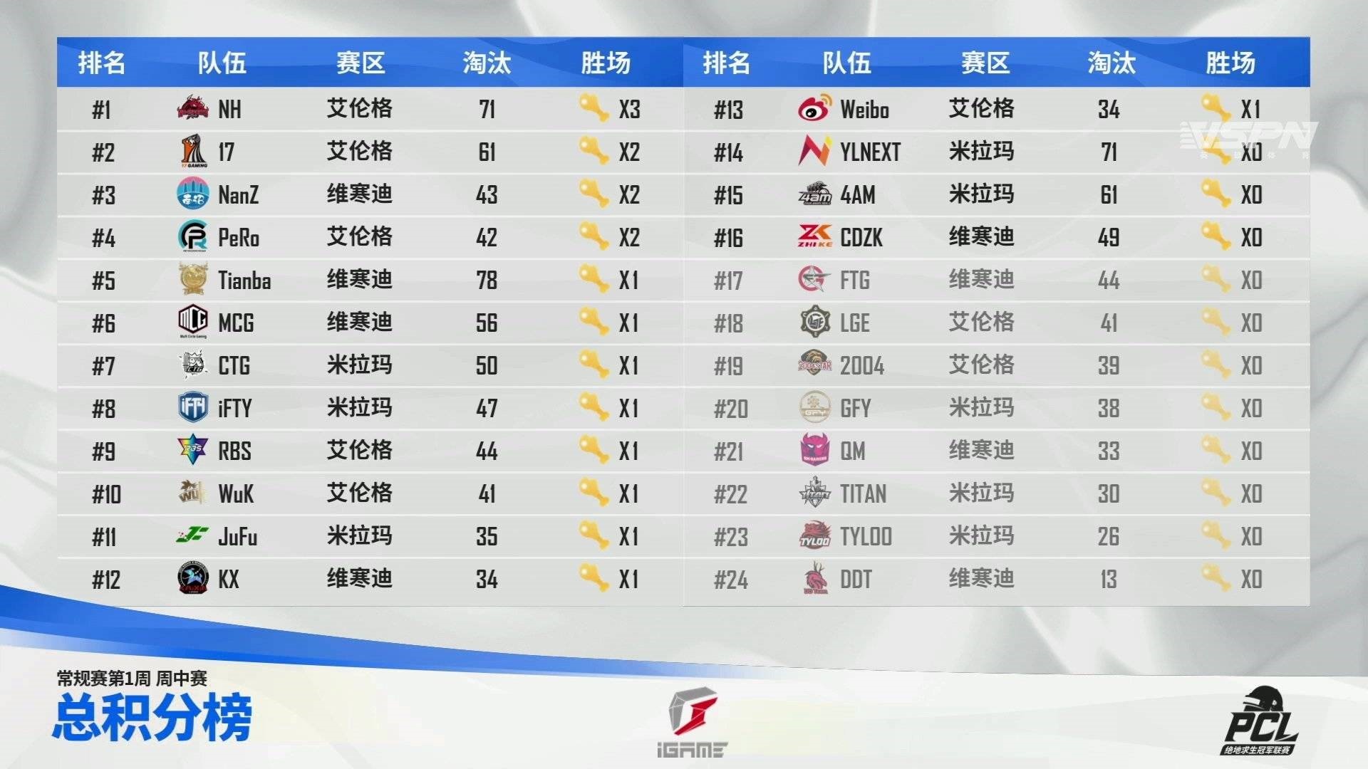 本次夏季赛的周中赛也采用吃鸡赛制来决出晋级周决赛的队伍。由于18场周中赛需要产生16支晋级战队,因此有概率会有零鸡高淘汰的战队进入周决,这也一定程度提升了周中赛的观赏程度。在首周周中赛中,NH战队四人均表现亮眼,凭借3鸡71个淘汰数的火热表现,以头名闯入周决赛。17、NanZ、PeRo三支战队均收获2鸡紧随其后,携手进入周决。纵观首周的晋级名单可以发现,几支赛前的热门战队均顺利会师周决。其中,获得PCS4东亚赛前八名的5支PCL战队PeRo、KX、MCG、17、4AM,传统豪强Tianba、iFTY战队以及三支PCLP新晋战队RBS、NanZ、FTG都位于周决赛之列,这也让众多观众对周决赛充满期待。