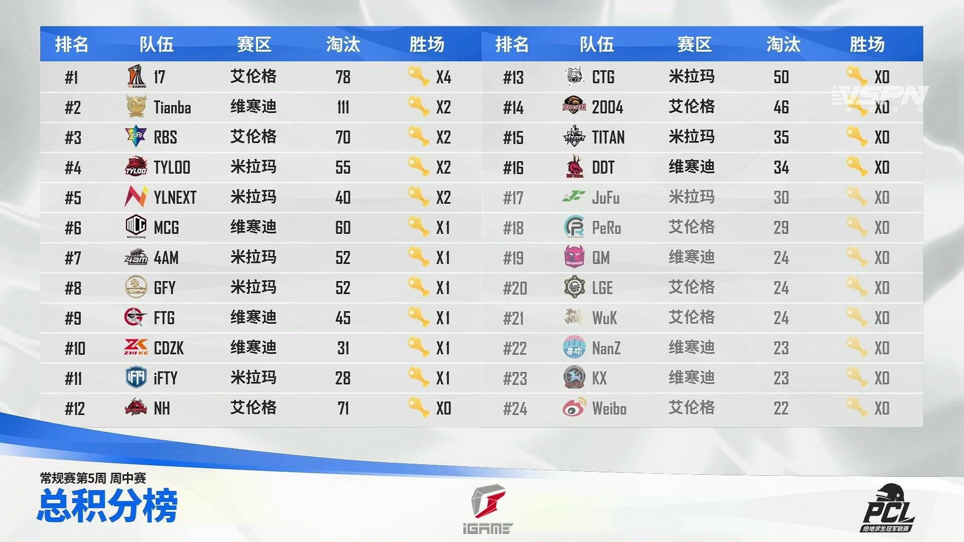 周中赛:17战队4鸡领跑,Tianba战队火力全开