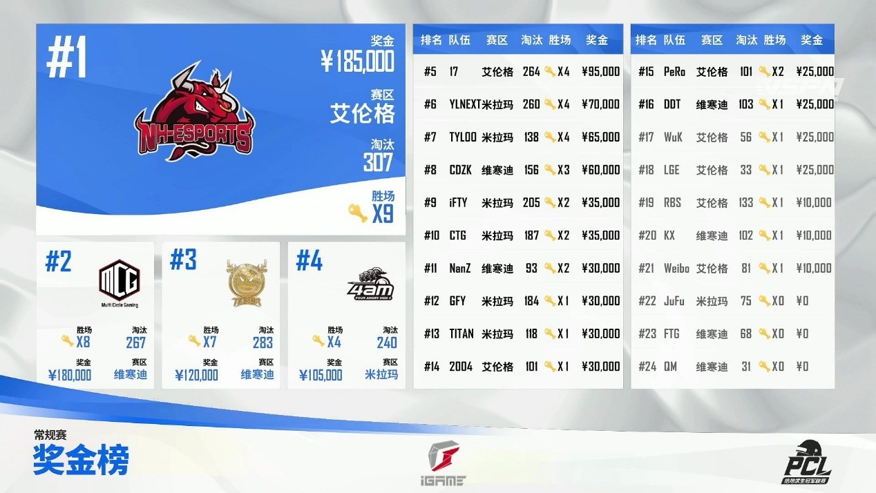 常规赛奖金榜:NH战队领跑晋级季后赛,米拉玛赛区表现不俗