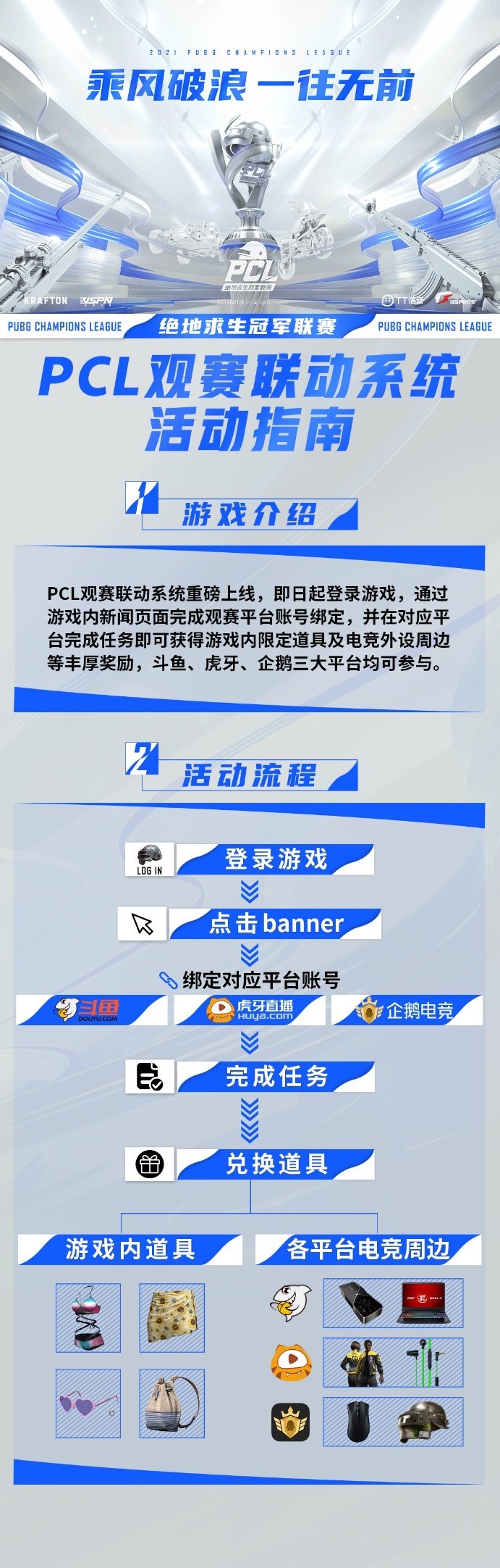 活动流程:登录绝地求生游戏,点击banner,绑定直播平台账号(斗鱼、虎牙、企鹅均可)并完成指定活动任务后,即可领取游戏内限定道具,更有各平台电竞周边等你来拿。