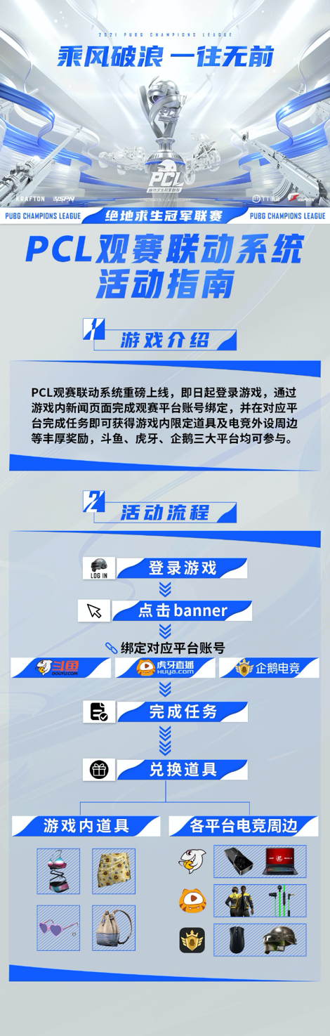 PCL观赛联动系统重磅上线,即日起登录游戏,通过游戏内新闻页面完成观赛平台账号绑定,并在对应平台完成任务即可获得游戏内限定道具及电竞外设周边等丰厚奖励,斗鱼、虎牙、企鹅三大平台均可参与。