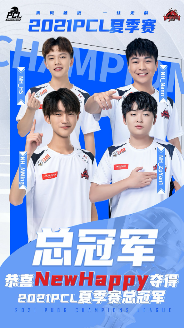 【Krafton Inc.旗下PUBG工作室】乘风破浪,一往无前!由Krafton Inc.旗下PUBG工作室举办的2021年绝地求生冠军联赛(PUBG CHAMPIONS LEAGUE,简称“PCL”)夏季赛季后赛经过5天30场的精彩对决圆满落幕。NH战队在最后一局力挽狂澜,以4胜198个淘汰数获得2021PCL夏季赛总冠军,不仅将¥550000的奖金收入囊中,更是获得直通PGC全球总决赛的名额。GFY战队在季后赛迎来爆发,以4胜147个淘汰摘得亚军,奖金数为¥400000。17战队火力全开,以3胜149个淘汰位列第三,收获了¥300000的奖金。PeRo,CTG和MCG战队分列四到六名,这六支战队也将代表PCL赛区晋级9月份举行的PCS5东亚洲际赛。