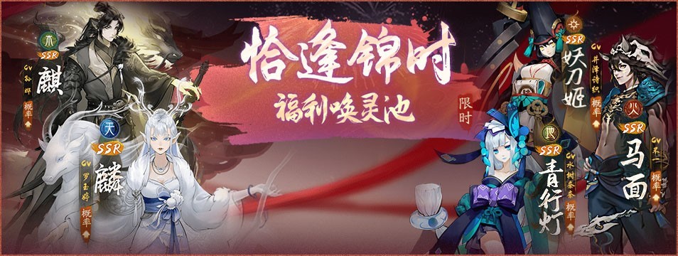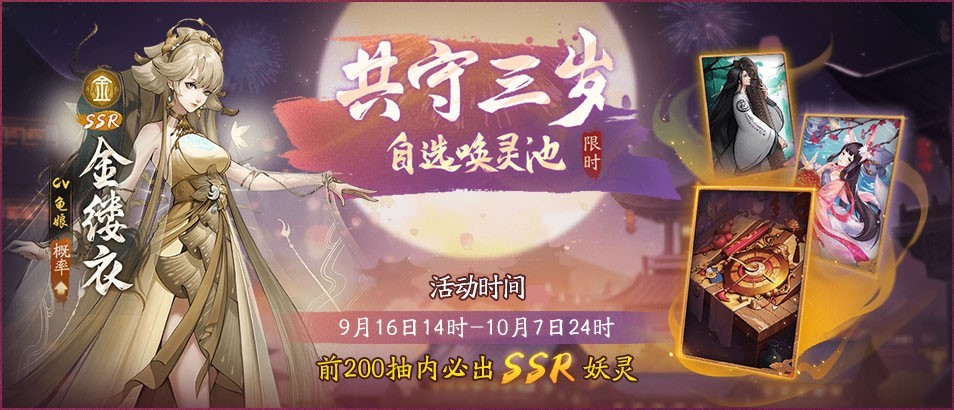 “恰逢锦时”同时开放三个卡池,分别对应不同属性的限定SSR妖灵,大人们召唤之前可以随意选择自己钟意的一个,也可以通过付费玉壁进行连抽或是重置结果。而在“共守三岁”卡池中,大人们可以通过签到获得五行、日月星、天地人卡池任选开启券,解锁自选召唤池并提升大人指定的SSR妖灵概率。