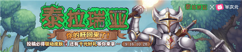 如果你是二次元玩家,那你一定不能错过半次元活动。为了迎接“你的肝回来了”,他们9月16日就迫不及待地开启了内容征集活动。不论是为了《泰拉瑞亚》进行的随笔创作,还是在泰拉瑞亚通关时令人兴奋的瞬间,只要投稿相关图、文、视频,就能获得《泰拉瑞亚》x 半次元像素风格联动头像框以及游戏内联动皮肤。