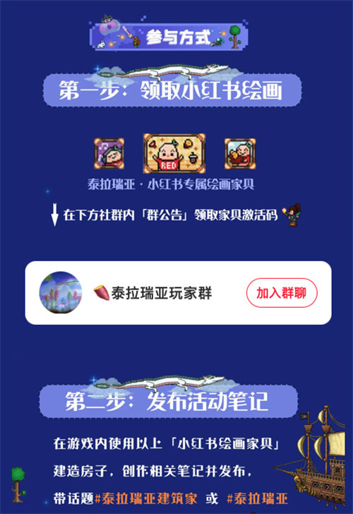 队友仍不够的你,可以来小红书泰拉瑞亚玩家群寻找更多冒险家。加入群聊即可在群公告中领取小红书专属绘画家具,在《泰拉瑞亚》国服手游版中使用家具,并带话题#泰拉瑞亚建筑家#发布小红书笔记,点赞量前30名的优质作品,还可以获得现金大奖。