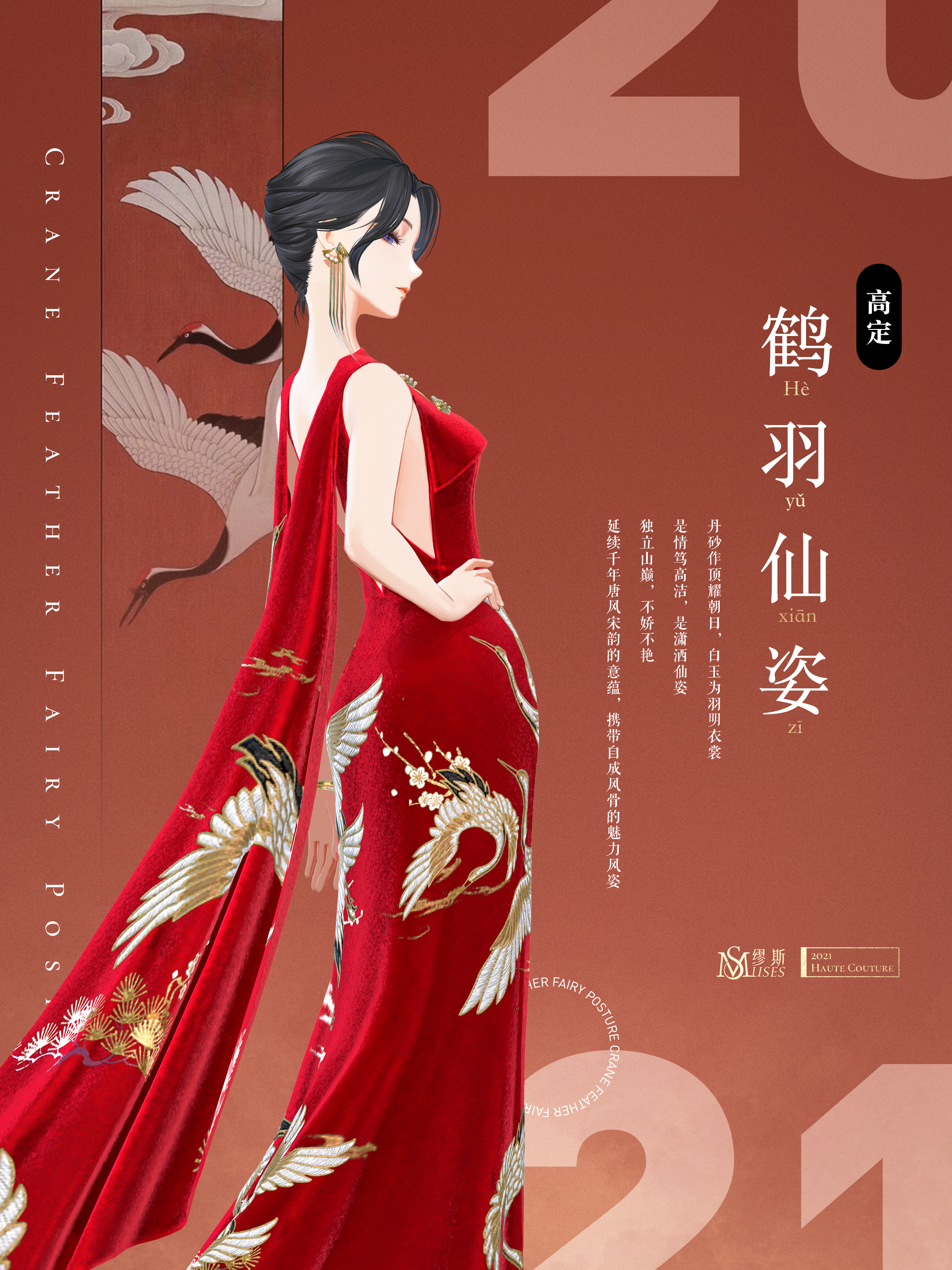 刺绣则是中国传统的仙鹤、松柏、梅花等纹样。仙鹤挥翅仰首,恣意潇洒;松梅点缀其中,自有风骨。既有从唐宋延绵至今的古典意蕴,又不乏高洁端庄的绝代风姿。这样一套将国风气韵与现代时尚完美结合的高定礼服,是女明星走红毯的不二之选。