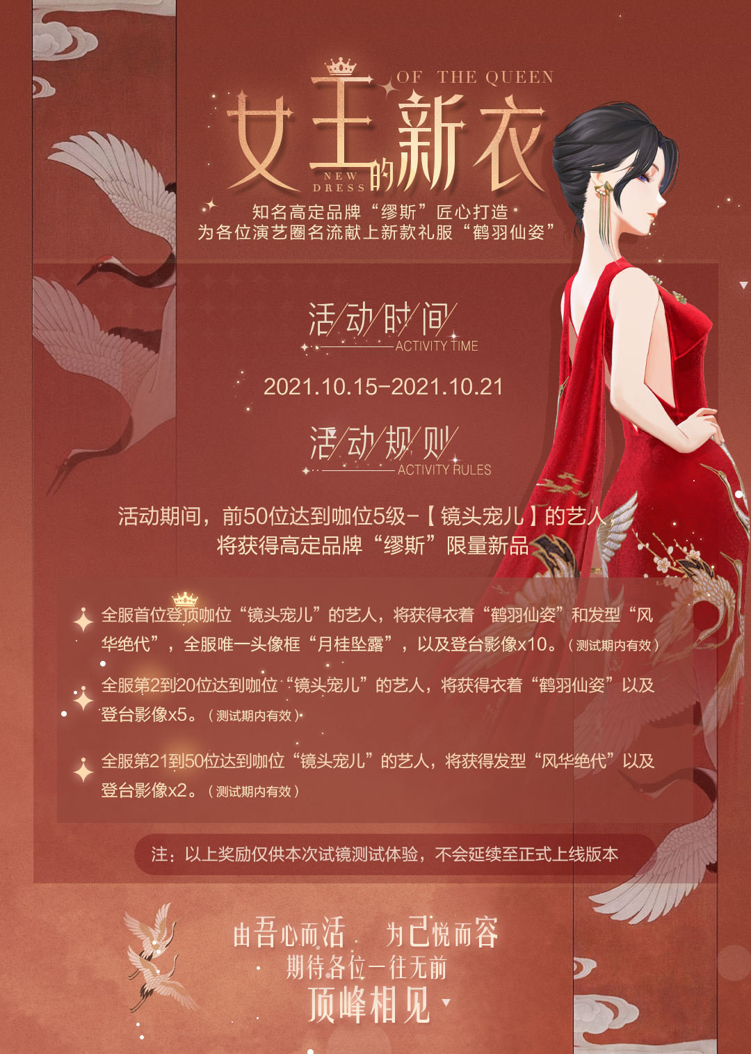 既然是限量的高定礼服,想要获得它,也需要女明星们付出更多的努力。随着游戏上线,《绝对演绎》开启了“女王的新衣”活动,在二测期间,首位达到咖位5级“镜头宠儿”的玩家,将获得高定礼服·鹤羽仙姿、限定发型·风华绝代以及头像框和游戏资源奖励。