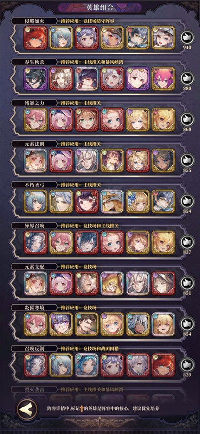 而不懂的或者还不会研究阵容的玩家也不要担心,在游戏主页面的右下角有个“英雄组合”按钮,点击一下就多种多样适合不同场景的英雄组合,不仅详细分析的阵容的优劣,也列出了每个英雄的站位和相应的魂石。可以说得上是保姆级攻略了。