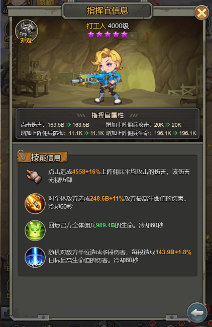 指挥官可使用金币升级,等级越高,点击伤害越高,技能伤害也越高,升到一定等级还可以进阶;