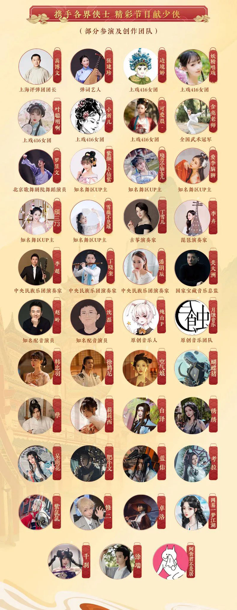 各界名士联手开演,精彩节目献给少侠们!一起看看有哪些你熟悉的侠士吧!