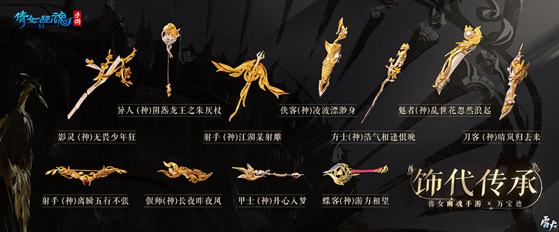 射手【江湖某射雕】金凰展翅,凤翔九天,弩箭编织的花纹犹如凤凰涅槃;【离瞬五行不张】长弓乖张,红水晶的点缀和那飘飞的尾羽,众星拱月般衬托出它的不凡;甲士【丹心入梦】大开大合的长杆斧枪,辅以红玉宝石点缀,沉稳霸道中又不失神秘妖艳;刀客【晴岚归去来】一刃西来破碧空,流光电照耀天穹;侠客【凌波漂渺身】鎏金熠熠,编织的龙鳞如凌波一般缥缈,踏雪卧冰;方士【浩气相逢恨晚】金龙栖于枝,枝下桃花开。