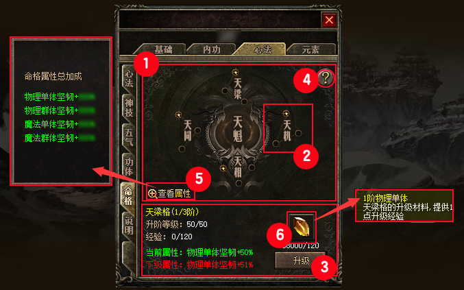 命格分为4个普通命格和1个高级命格!(以下示图为:五大命格满级,全部点亮的状态)