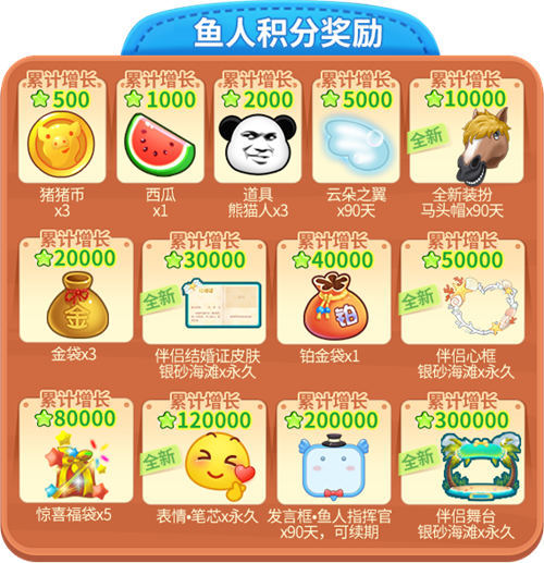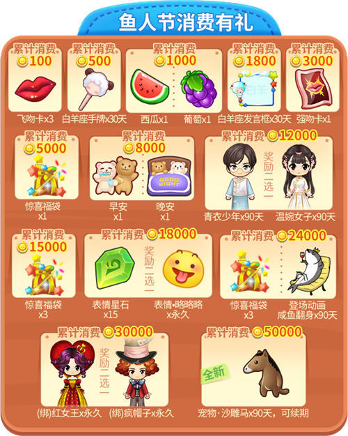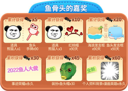 活动期间,每天完成“鱼人大使的任务”即可获得“鱼骨头”,根据累积获得的“鱼骨头”数量,领取特别奖励!