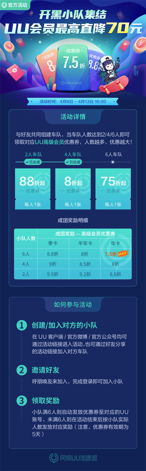 本次活动时间为4月8日-13日,参与方式非常简单,队长可以选择开启2人、4人、6人小队,之后通过邀请好友入队的方式增加小队成员,每位用户只能发起或参与一个小队。小队人数达到后,优惠券将自动发放到你的UU账号内,根据小队人数优惠券也不同噢,下面是小队人数对应的奖励,大家可以参考一下噢。