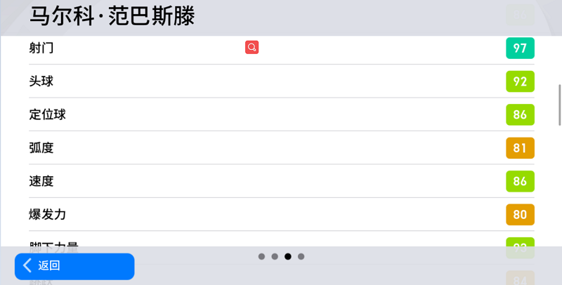 在关键的得分能力上,范巴斯滕拥有97的射门值,4的非惯用脚精准度,92的头球值,这就表示范巴斯滕浑身上下的“部件”都可以用于射门拿分,可以预见,只要有人愿意把球传给他,荷兰人就能打出令全场惊叹的神奇破门!