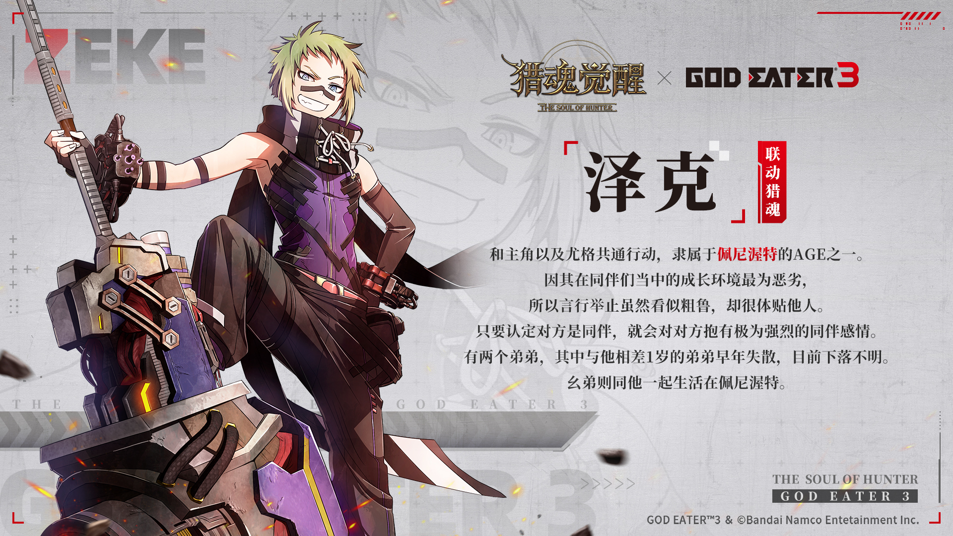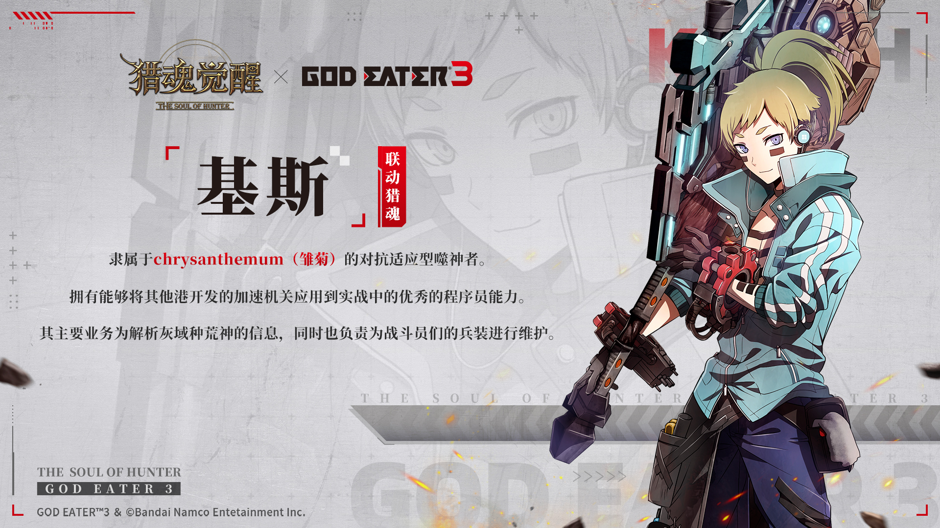 网易超真实团队狩猎手游《猎魂觉醒》与动作冒险人气大作《噬神者3》即将开展重磅联动,第一弹定档9月29日!大范围“灰域”危机来袭,只有AGE(对抗适应型噬神者)才能耐受灰域的侵蚀,带来胜利的希望。来自《噬神者3》的AGE新同伴登场,快来认识他们吧!