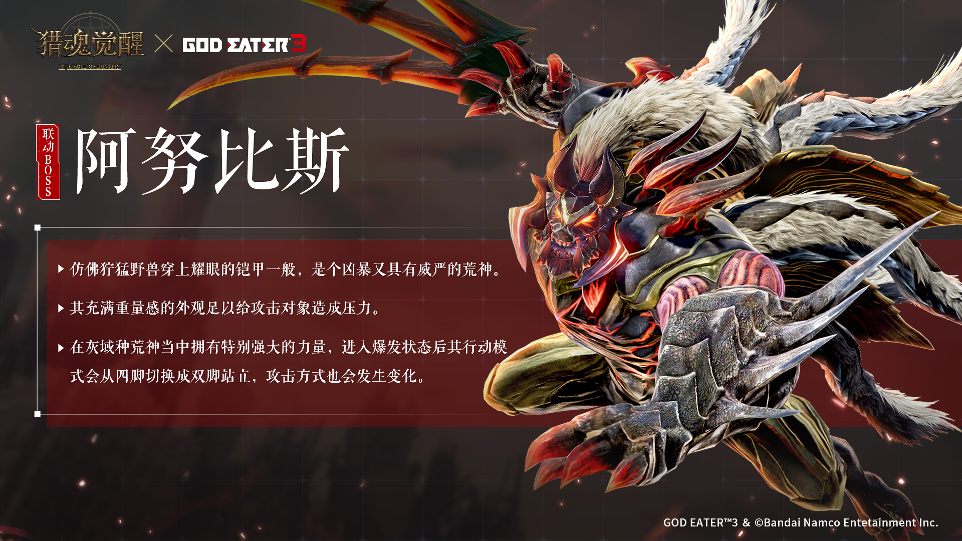 网易超真实团队狩猎手游《猎魂觉醒》与动作冒险人气大作《噬神者3》即将开展重磅联动,第一弹定档9月29日!联动主KV曝光,荒神降临毁天灭地,亟待勇士保卫家园!