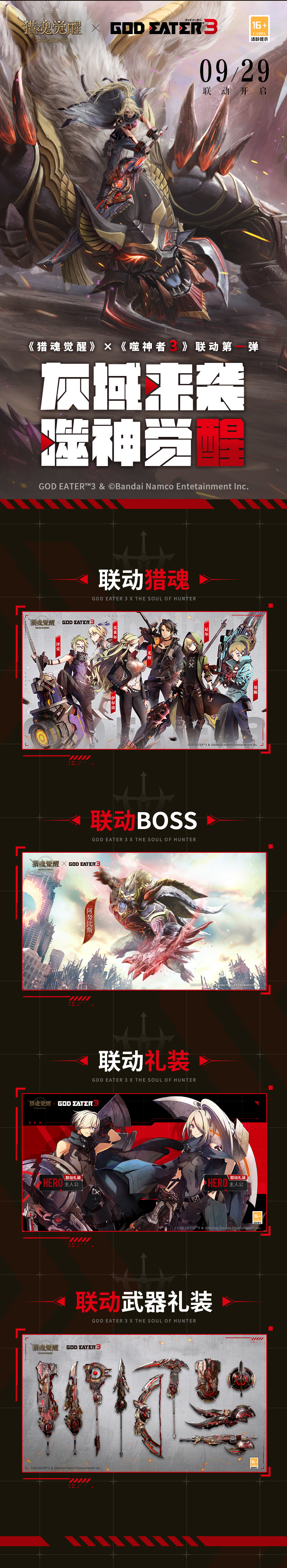 联动即将正式开启,神机培养、猎魂伙伴羁绊以及休闲副本-“偏食场脉冲”等活动即将上线,玩家和boss相互捕食,成为神,还是成为人?更有联动剧情、联动礼包等内容开放,敬请期待!