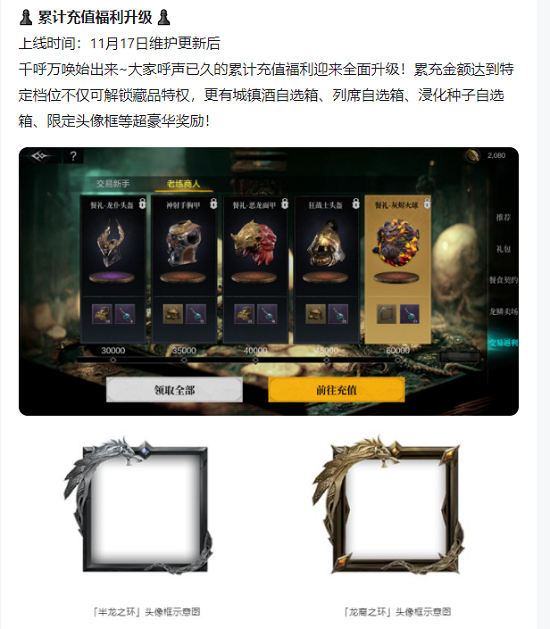福利肯定是所有玩家最关心的点,虽然此前的更新中已经增加了玩家们呼声最高的累充奖励,但官方依然在本次更新中对这部分福利进行了升级。除了自选礼包以外,藏品、限定头像框等奖励应有尽有,对比之前的充值奖励,提升了好几个档次,在一定程度上提升了玩家们的充值感受。