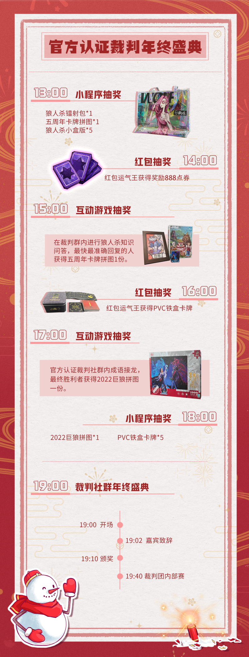 2022年12月16日19点,狼人杀官方认证裁判社群年终盛典开启,在年终盛典上将颁发年度优秀裁判、新人裁判等奖项,同时还有知识竞答、成语接龙等趣味活动,更有官方认证裁判友谊赛高手对局,看裁判们一决高下!