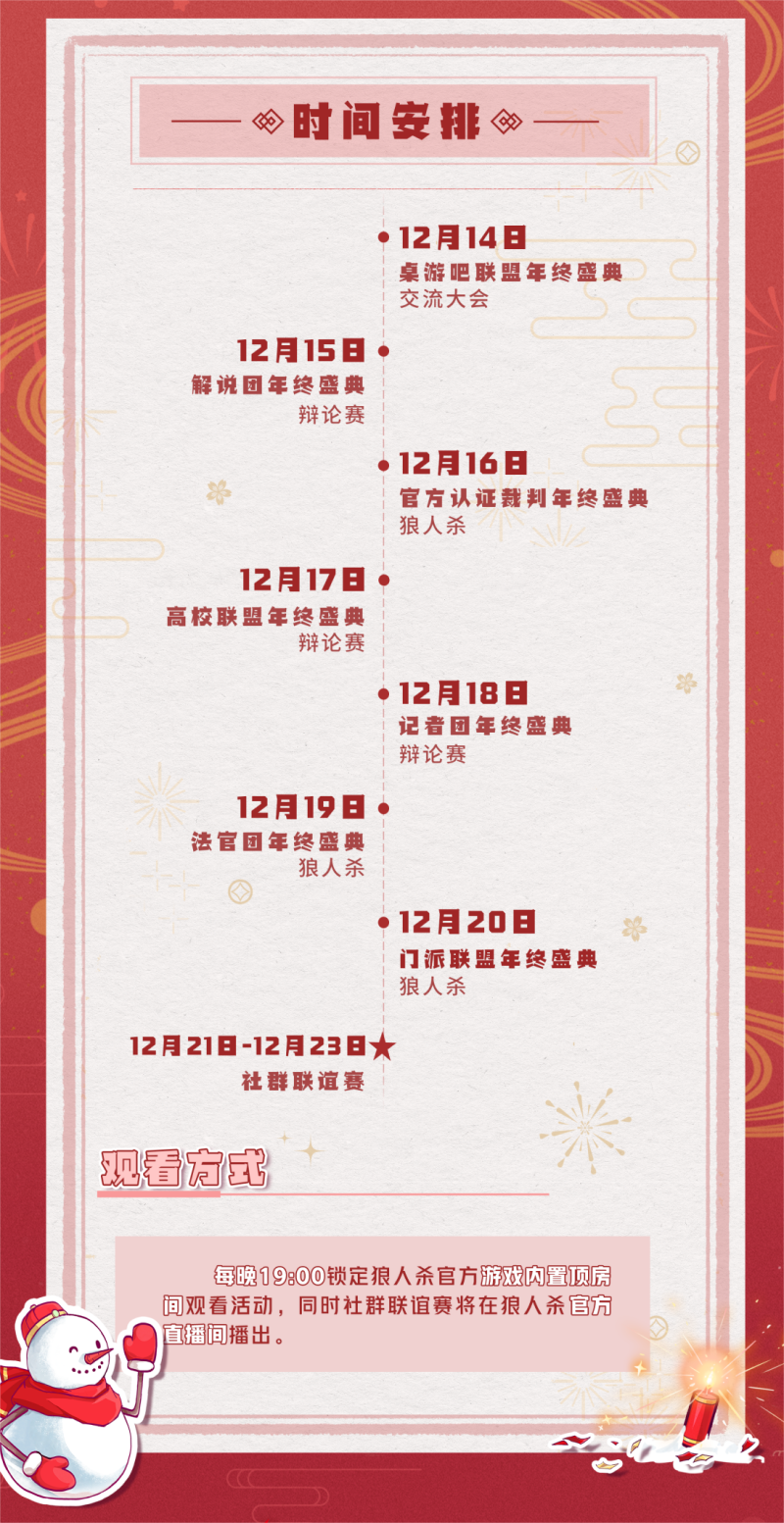2022年12月14至20日每晚7点,各社群年终狂欢轮番上演,玩家们记得准时锁定游戏置顶房间,寻找与你志同道合的的狼队友。2022年12月21日至23日,各社群顶尖高手将展开紧张刺激的友谊赛,狼队友可以前往狼人杀官方直播间进行观看!