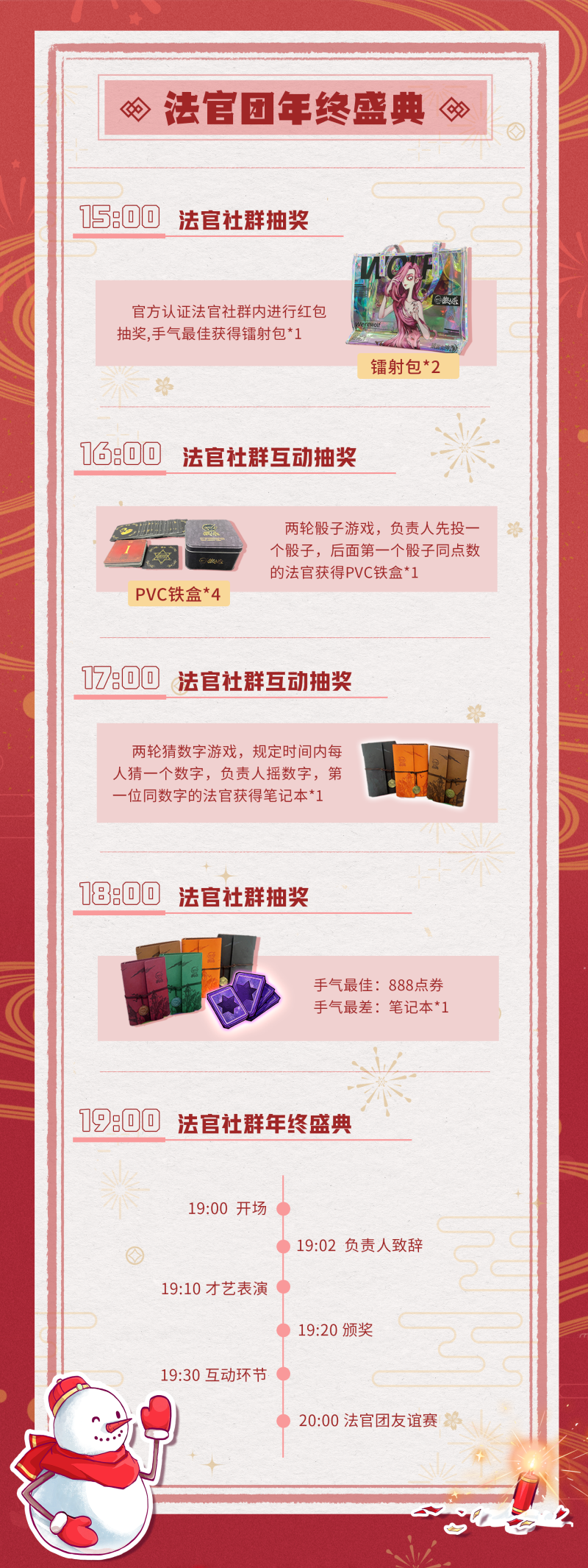 2022年12月19日19点,狼人杀官方法官团年终盛典来袭,谁会成为本年度最佳法官呢?谜底将在当天正式揭晓!还有四轮社群抽奖等你领取好运,才艺展示、经历分享等互动环节等你来参与,最后还将有法官们带来的友谊赛,高手云集,一起期待官方法官的表现吧!