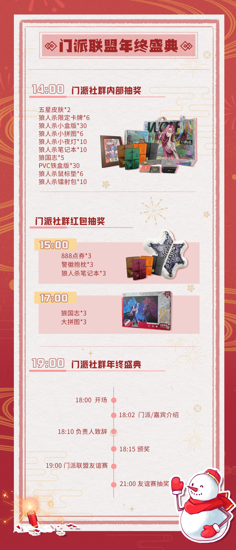 群狼聚首,年终狂欢!为感谢各位狼队友们连续五年的陪伴与支持,《狼人杀官方》特此举办狼人杀官方社群年终盛典,诚邀狼队友们前来赴约!门派联盟、高校联盟、桌游吧联盟、官方认证裁判、记者团、解说团、法官团七大社群集结,开启趣味狂欢!狼人杀官方社群联谊赛、趣味娱乐活动还有热闹的社群纳新等你来参与,更有超多社群红包与专属福利等你来拿!