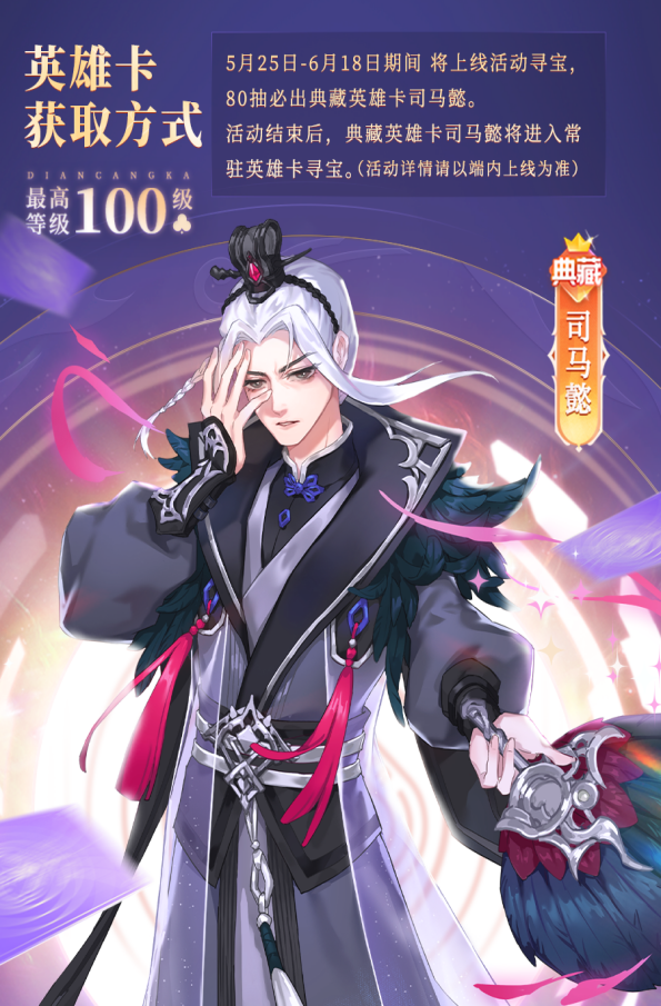 除了精美的套装以外,首款典藏英雄卡司马懿出世。司马懿拥有超强双技能,一技能【天命】可将特定范围内的1张牌点数增加/减少,二技能【鹰视】则是每次打出手牌都会有额外得分,十分实用。此外,司马懿英雄卡还有80抽保底,若是英雄卡角色等级达到满级100级,还可获得同款极品时装!
