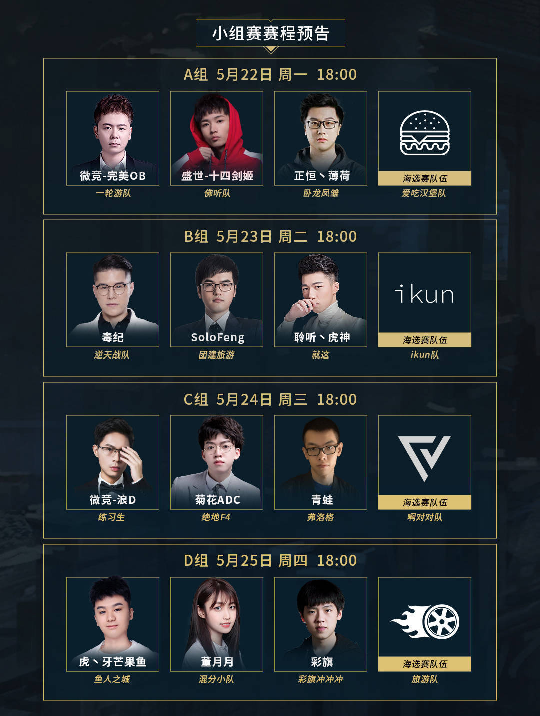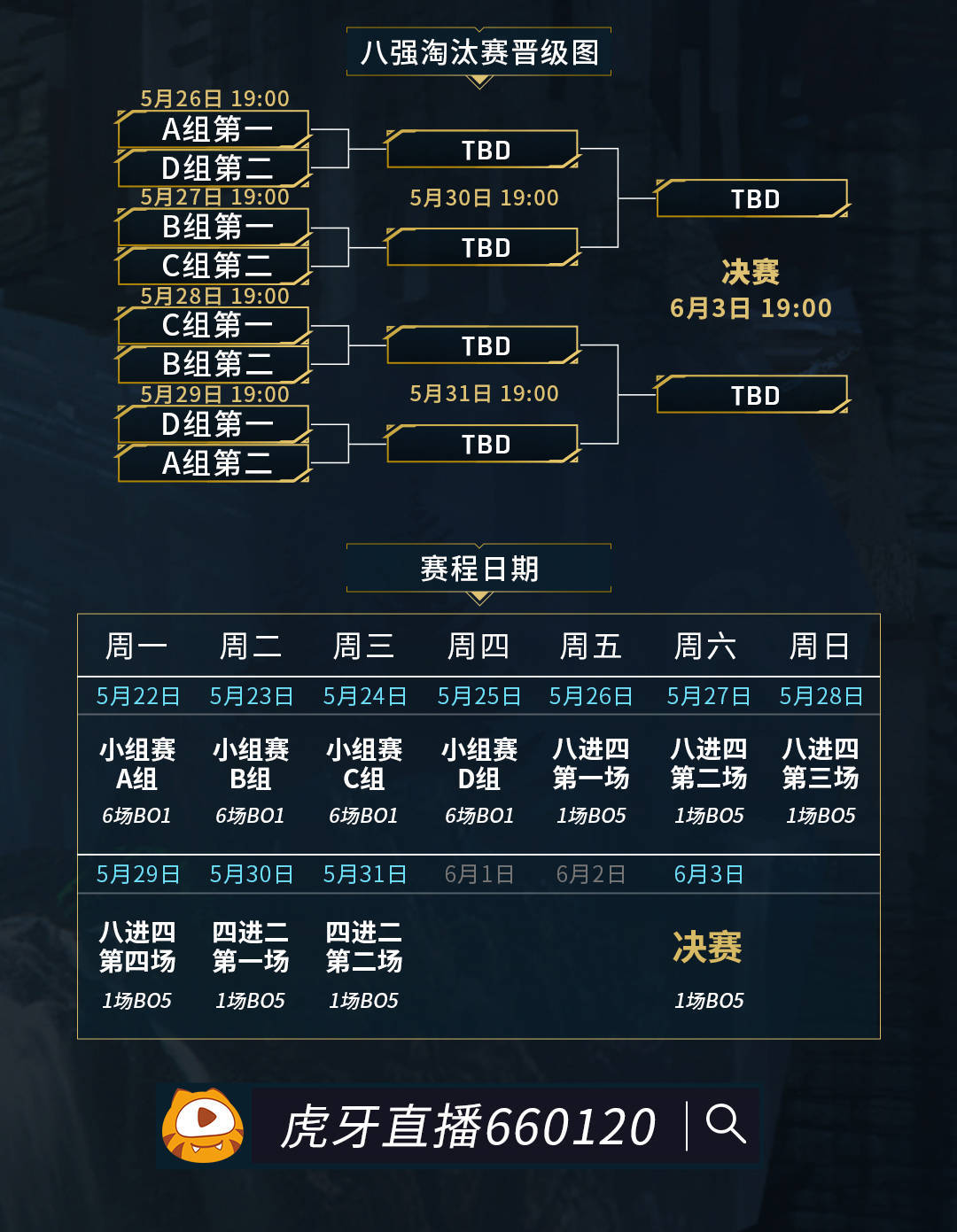 5月22日-6月3日比赛期间,虎牙直播间将全程直播,其中不仅有精彩纷呈的赛事,当日比赛结束后,还将邀请当天获胜战队对精英时刻及选手进行点评、分析,并回答弹幕观众留言最多的提问。本次赛事采用英雄联盟国服最新版本,在电信一区艾欧尼亚区中进行,比赛模式为召唤师峡谷-竞技征召模式(5BAN)。海选报名的所有战队按照队内5名队员的平均段位(当前赛季)进行排名筛选,排名前16的战队获得民间海选赛的参赛资格。16支民间海选赛战队随机抽签分组,分为四个小组,每个小组4支战队,小组内进行四强BO1单淘,四个小组第一晋级本次比赛小组赛正赛。12支主播战队抽签分组,每组3支主播战队,4支海选晋级战队抽签分组,每组1支海选晋级战队。比赛采取BO1单循环赛制,小组前2晋级淘汰赛。淘汰赛采取8强单败BO5淘汰赛,最终决出2支战队进入决赛。最终胜出的2支战队进行BO5决赛,获胜战队夺得本次比赛冠军。