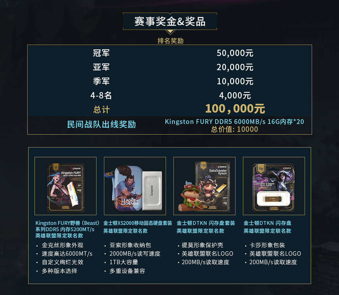 金士顿为本次赛事准备了丰厚的奖金及奖品,其中冠军奖金50000元,亚军奖金20000元,季军奖金10000元,4-8名奖金4000元,出线的4支民间战队将获得奖励:Kingston FURY 野兽(Beast) 系列DDR5 RGB内存 6000MT/s 16GB英雄联盟限定联名款共计二十套。不久前金士顿还推出了英雄联盟限定联名款系列存储产品,其中包括暴走萝莉 金克丝为主题的Kingston FURY 野兽(Beast)系列内存,疾风剑豪 亚索为主题的金士顿XS2000移动固态硬盘套装,迅捷斥候 提莫为主题的金士顿DTKN闪存盘套装,以及虚空之女 卡莎为主题的金士顿DTKN闪存盘。金士顿联合英雄联盟推出的限定联名款系列存储产品,不仅拥有高性能、大容量和品质出众等特点,独特的主题限定设计还能够满足玩家对存储产品风格个性化的需求,让更多的玩家能够通过金士顿高性能、高品质和高颜值的存储产品感受不一样的游戏乐趣。