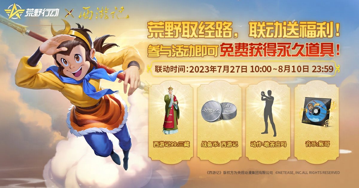 本次《荒野行动》×《西游记》动画联动于7月27日10点正式上线,持续至8月10日。活动期间除大量联动内容上线外,将同期开启众多福利活动,更有福利活动上线,完成任务即可免费获得唐僧金装!
