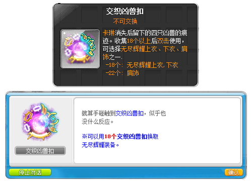成功击败首领卡琳后,收集掉落的交织凶兽扣可兑换250级无尽辉耀装备!