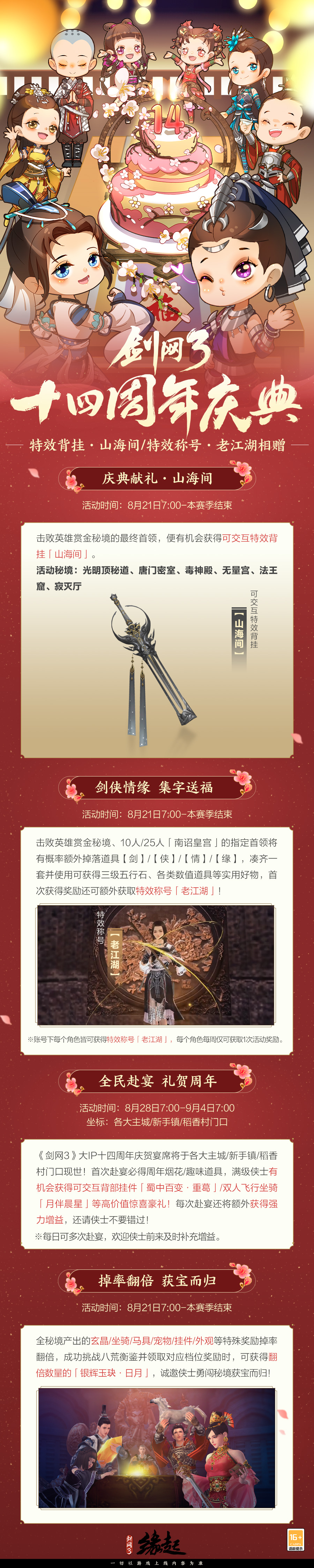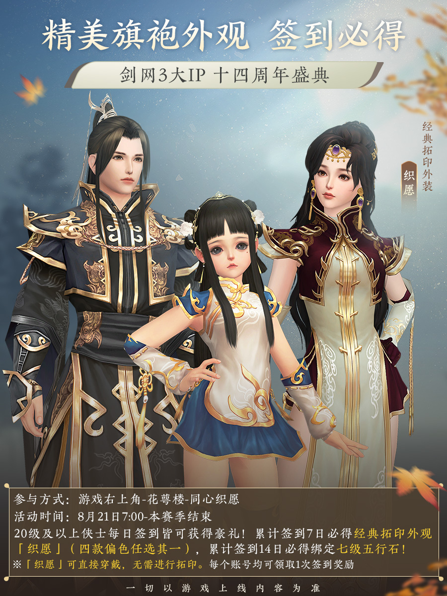 七夕巧遇周年,双喜临门好礼更多!剑网3大IP十四周年庆典8月21日上线!签到必得经典拓印外观【织愿】/七级五行石,更有可交互特效背挂【山海间】/特效称号【老江湖】相赠,闯荡江湖还可享秘境珍稀道具双倍掉率!8月28日7:00-9月4日7:00期间,各大主城、稻香村、新手镇会放置团年宴席共贺周年,首次食用必得周年烟花、趣味道具,满级侠士有概率获得不绑定珍稀奖励;每次食用还可获得增值气劲!礼邀群侠共贺大唐盛典!