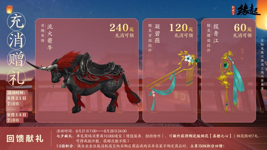 全新充消好礼来袭!8月24日至新资料片上线期间,侠士累计充消达指定档位,即可领取腰部挂件【揽青江】、背部挂件【凝碧薇】、萌趣功能跟宠【流火夔牛】。活动期间,侠士在全区全服消耗通宝购买绑定商品、购买并实装不绑定商品立享150%积分回馈!除此之外,更有七夕献礼相送,单笔商城消费满10000通宝(增值服务、捏脸除外),可额外获得绑定版限时烟花【真橙之心】!