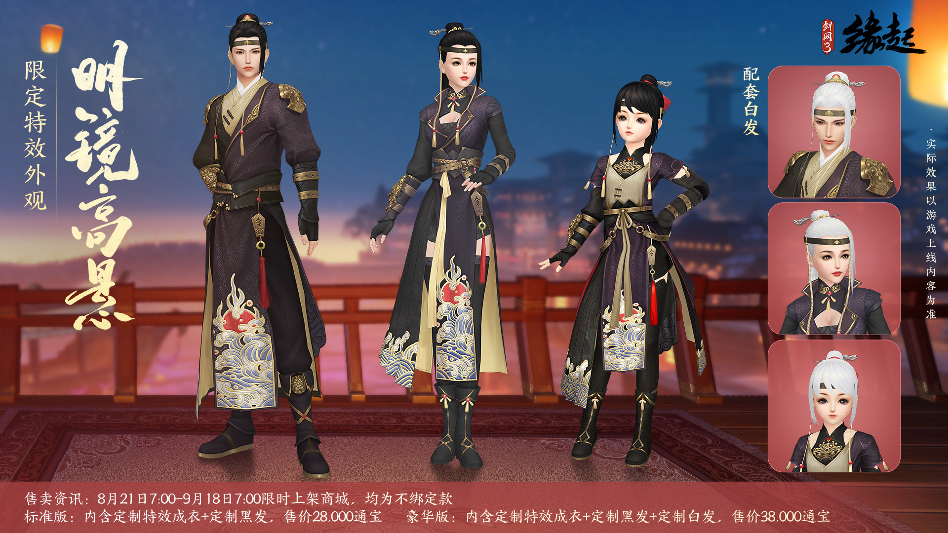 豪华版:内含对应偏色成衣【明镜高悬·衣】、黑发【明镜高悬·黑发】、白发【明镜高悬·白发】,将于8月21日7:00至9月18日7:00限时上架,售价38,000通宝,为不绑定款。