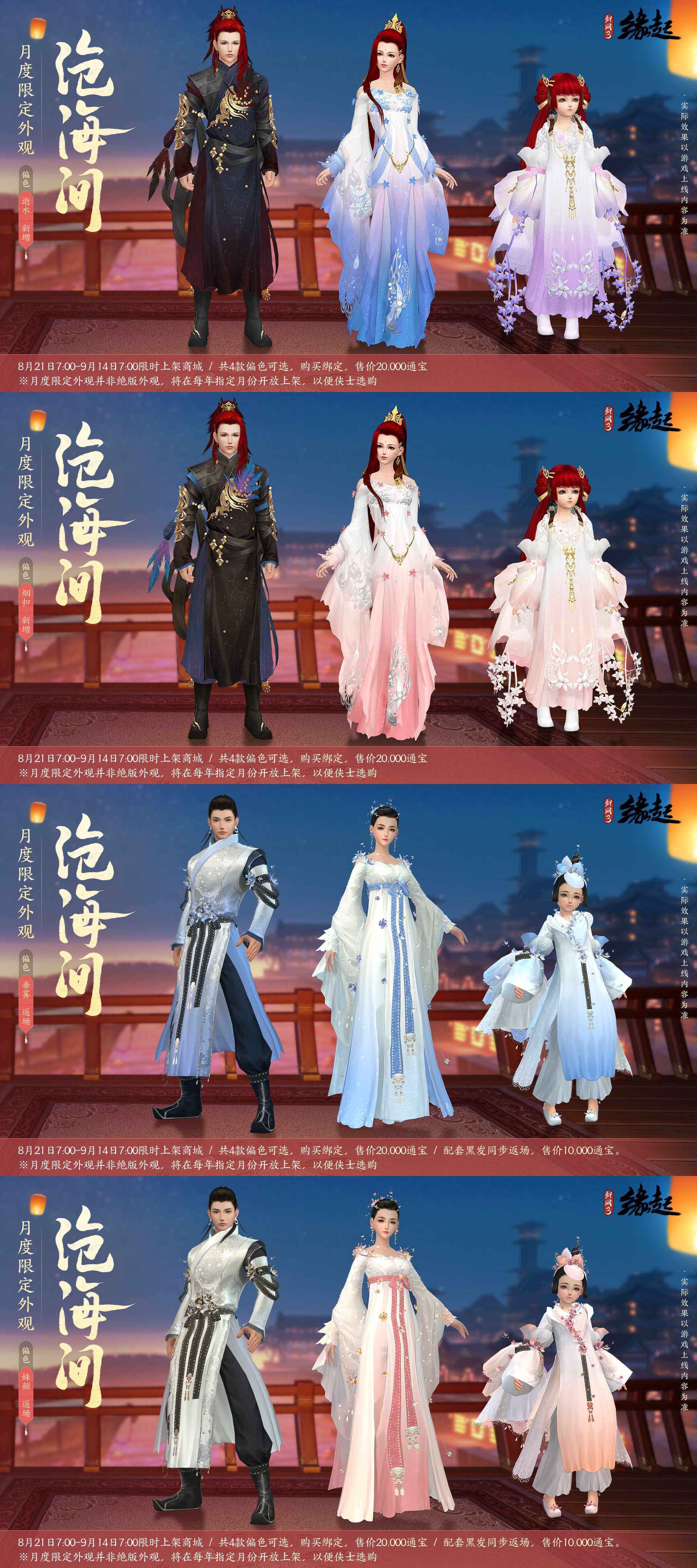月度限定主题外装【沧海间】上架商城,新增“烟扣”、“逝水”两款偏色可选,同时“姝颜”、“垂雾”两款偏色返场,将于8月21日7:00至9月14日7:00限时上架,为绑定款,售价20,000通宝,侠士可选择心仪偏色购买。返场外装配套绑定黑发同步上架,售价10,000通宝。