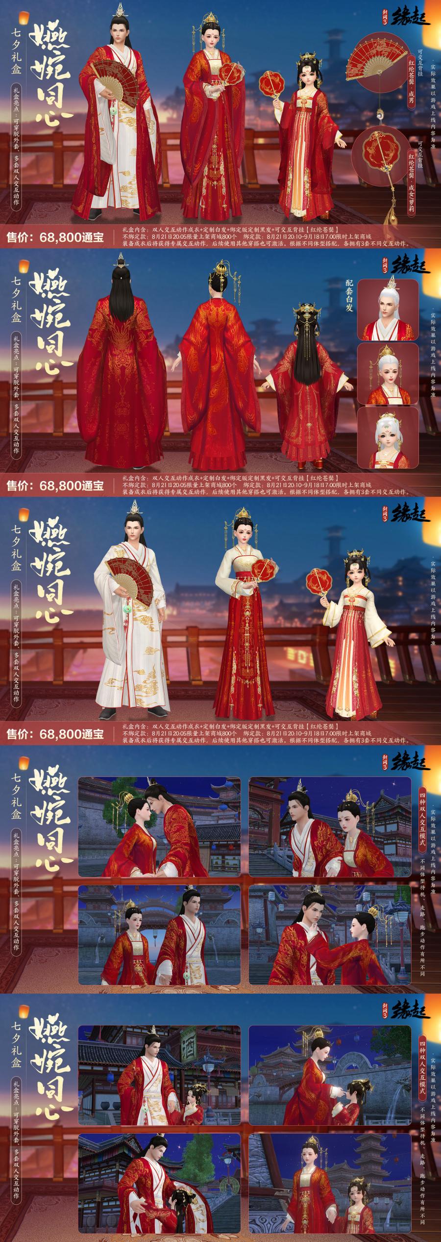 “嬿婉同心”七夕婚服主题外装礼盒上架商城,外装呈古风红色礼服,里衣外袍分体设计,龙凤金丝纹绣,尽显华贵端庄。礼盒内含特效成衣【嬿婉同心·衣】、定制黑发【嬿婉同心·黑发】、定制白发【嬿婉同心·白发】、永久可交互背部挂件【红纶苍鬓】。该外装礼盒具有三套双人交互动作,亲密互动显蜜意!