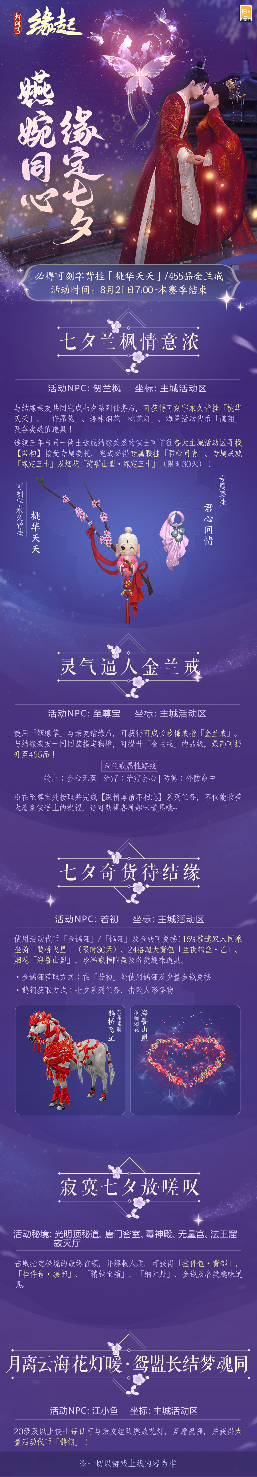 情正浓时,共度今宵。8月21日7:00至新版本上线期间七夕活动再临大唐,侠侣结伴参与必得可刻名背部挂件【桃华夭夭】,二人共闯指定秘境还可获得最高455品精品戒指。此外,活动期间连续三年与同一侠士达成结缘关系的侠士完成“缘定三生”委托还有腰部挂件【君心问情】和烟花奖励!七夕奇货好礼纷呈,更有限时115%移速双人同乘坐骑【鹊桥飞星】、24格超大背包、戒指附魔等佳品与君共度佳节!