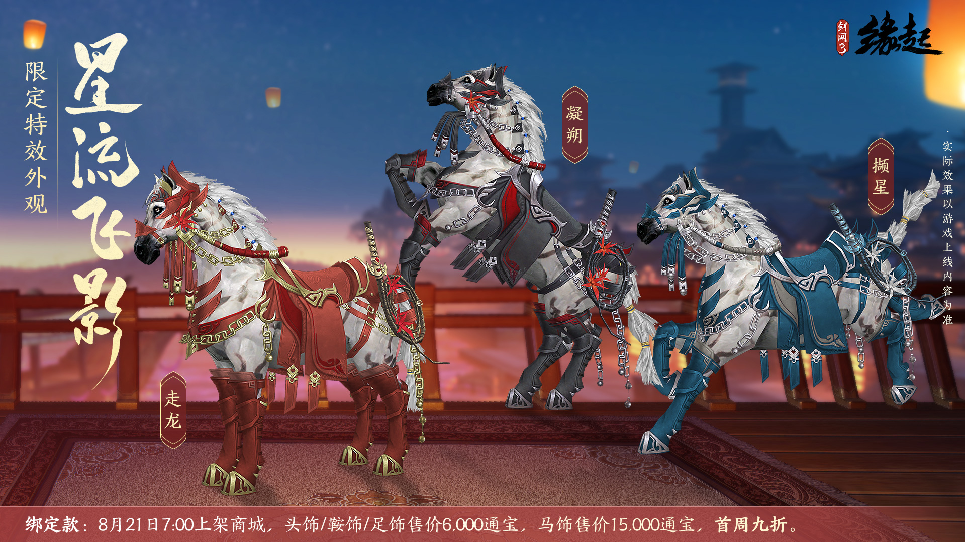 华贵马具套装“星流飞影”系列华贵马具套装将于8月21日7:00永久上架商城,马具设计别出心裁,缀以枫叶相饰,显良驹俊逸之态!共有“凝朔”、“撷星”、“走龙”三款偏色,心仪的侠士可尽快前往商城购买。头饰/鞍饰/足饰为绑定款,售价6,000通宝,首周享9折优惠。马饰为绑定款,售价15,000通宝,首周享9折优惠。